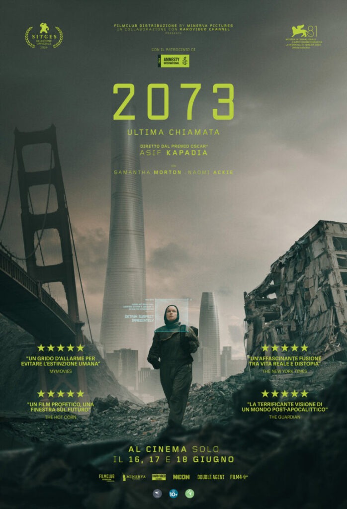 Presentato fuori concorso all’81ª Mostra Internazionale d’Arte Cinematografica La Biennale di Venezia, 2073 ultima chiamata di Asif Kapadia è un ibrido tra fantascienza distopica e denuncia contemporanea, nuovo orizzonte espressivo per l’autore di splendidi documentari più tradizionali come Amy e Senna, sarà nelle sale italiane soltanto per tre giorni dal 16 al 18 giugno grazie a FilmClub Distribuzione, in collaborazione con Minerva Pictures con il patrocinio di Amnesty International Italia.