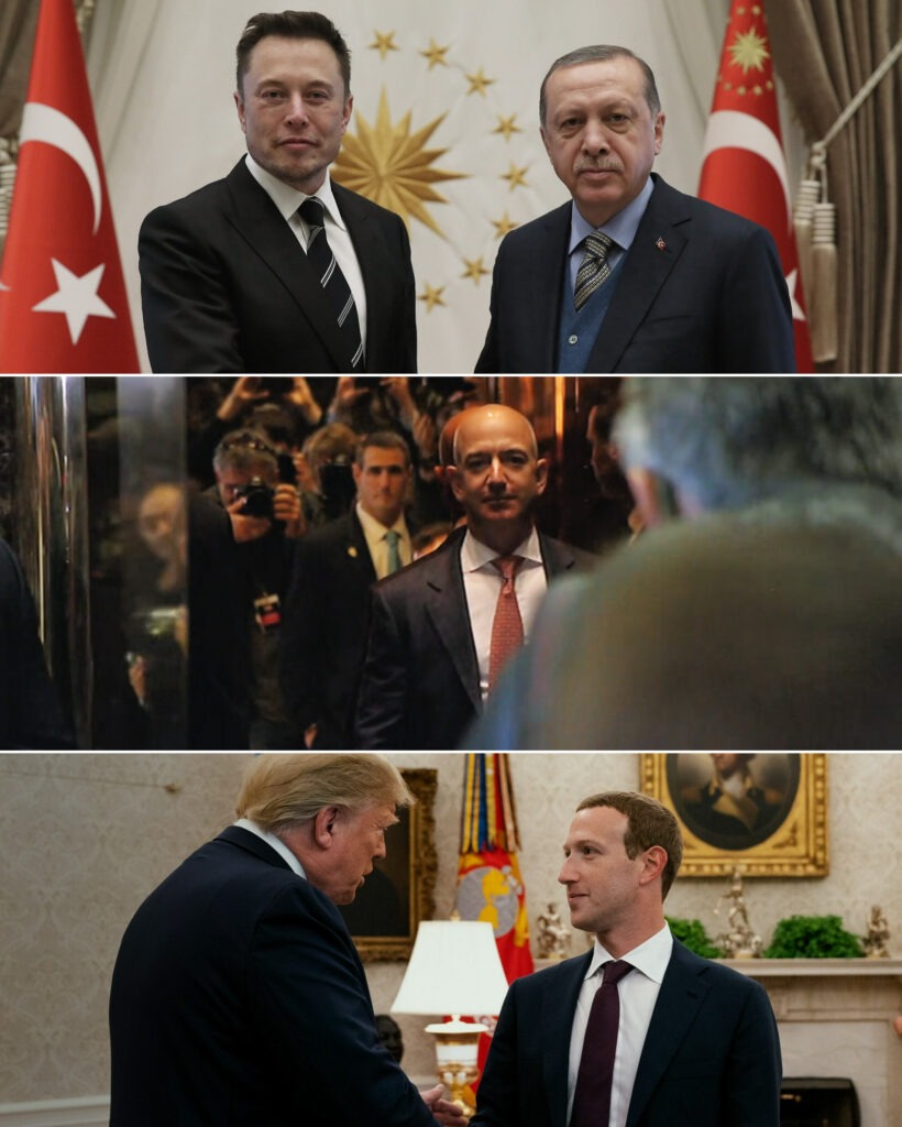 6. Nuovi sovrani padroni del mondo: Elon Musk a colloquio con il presidente turco Recep T. Erdoğan, Jeff Bezos fondatore e proprietario di Amazon, Mark Zuckerberg proprietario di Meta (Facebook e non solo) a colloquio con Donald Trump