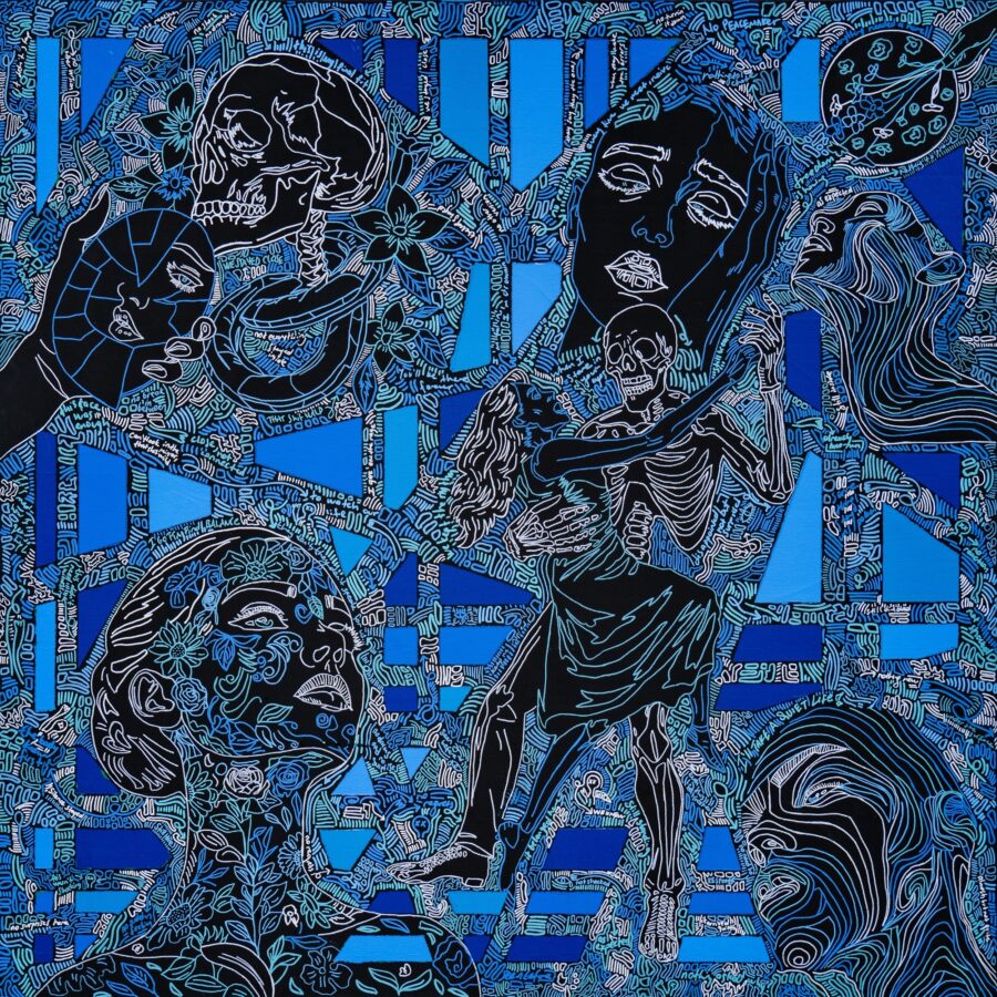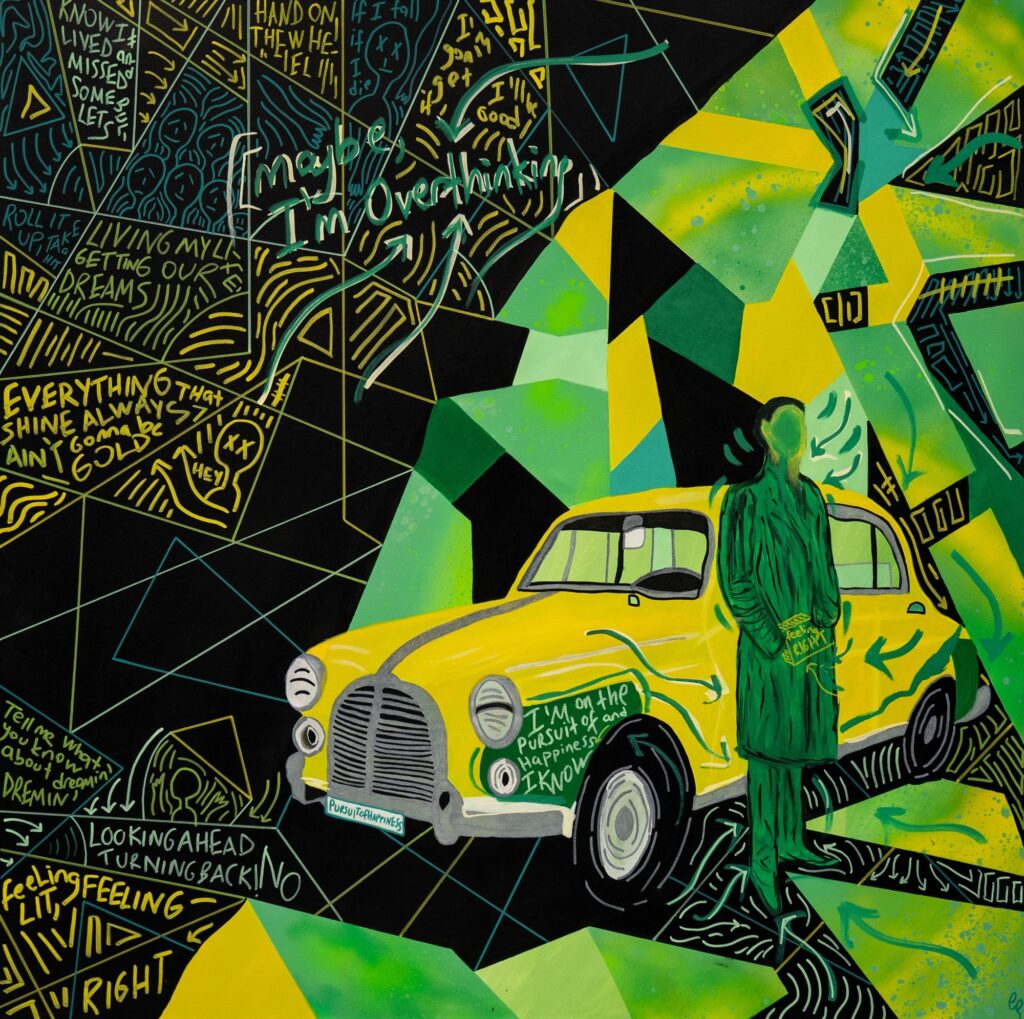In opere quali After the Silence o No Surprises, le figure che abitano le tele non sono ritratti convenzionali, ma apparizioni che emergono da campiture stratificate e trame geometriche, solcate da segni forti (spesso affidati al marker) che incidono la superficie come cicatrici.