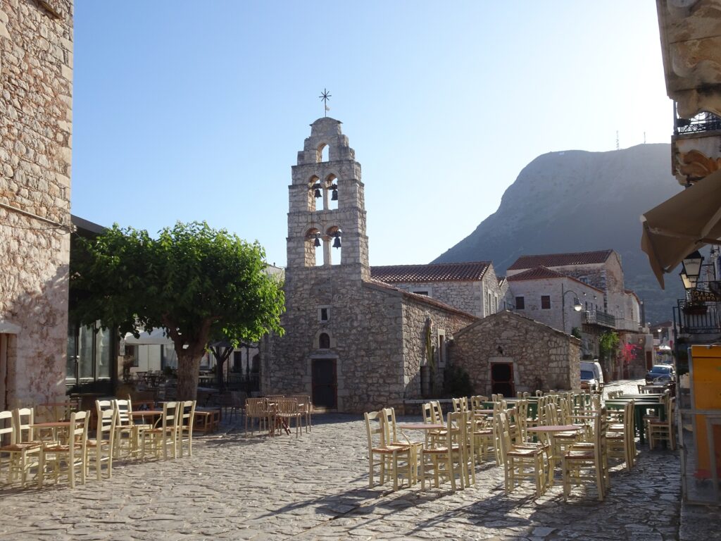 Il massiccio del Taigeto che domina Sparta – e sul quale la leggenda vuole si abbandonassero i neonati fragili e malformati – costituisce il naturale baluardo di difesa del Mani. Qui si entra in un mondo a parte, arido e roccioso, dove le costruzioni in pietra, alte e severe, non hanno niente in comune con le case imbiancate a calce, caratteristiche dei villaggi che popolano le coste dell’Egeo e le isole Cicladi. La cittadina di Areopoli è la porta d’ingresso al Mani profondo, con le sue antiche case-torri – alcune delle quali trasformate in museo – e le strette vie lastricate che convergono verso la piazza principale, dove la cattedrale dei Pammegisti Taxiarches spicca con il suo campanile a gradoni. La zona di Areopoli svolse un ruolo molto importante nella lotta di liberazione greca del 1821: su questa piazza il 17 marzo 1821 il popolo del Mani dette inizio alla rivoluzione contro l’occupazione turca, innalzando quella bandiera della rivolta nazionale che ora è esposta nel Museo Storico Nazionale di Atene.