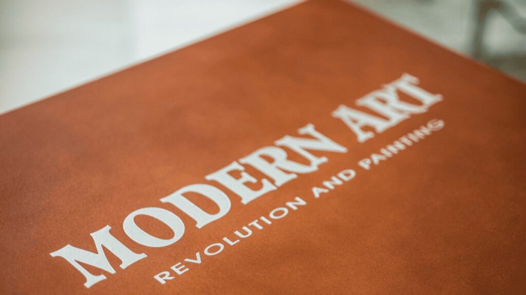 Da questa visione, nel 2002, nacque il volume esclusivo che si proponeva come un museo personale, fatto a libro. Concepito per essere oggetto d’arte a tutto tondo, rilegato a mano in betulla e pelle, è stato pensato per essere esposto su un leggio, come monumento d’arte vivente. Indubbiamente un prodotto d’alto artigianato in tiratura limitata e numerata, con copertina in legno rivestita in pelle chiara, punzonata con argento a caldo. Cinquecentoquarantaquatto pagine litografate a venticinque colori di massima qualità, che riproduce oltre duecentocinquanta capolavori del Diciannovesimo e Ventesimo secolo in formato aperto di 100×70 cm. Modern Art – Revolution and Painting” è un’opera progettata per massimizzare il piacere visivo e l’esperienza del lettore, distinguendosi per l’alta qualità della materia prima impiegata. Particolare attenzione è riservata alla fedeltà cromatica e al segno, con tavole che, ove possibile, rispettano le dimensioni reali dei capolavori e, già nel 2003, l’opera si distinse a livello internazionale: presentata alla 54ª edizione della Fiera Internazionale del Libro di Francoforte, attirò l’attenzione del Financial Times, che le dedicò un’intera pagina, riconoscendone il valore artistico ed editoriale.