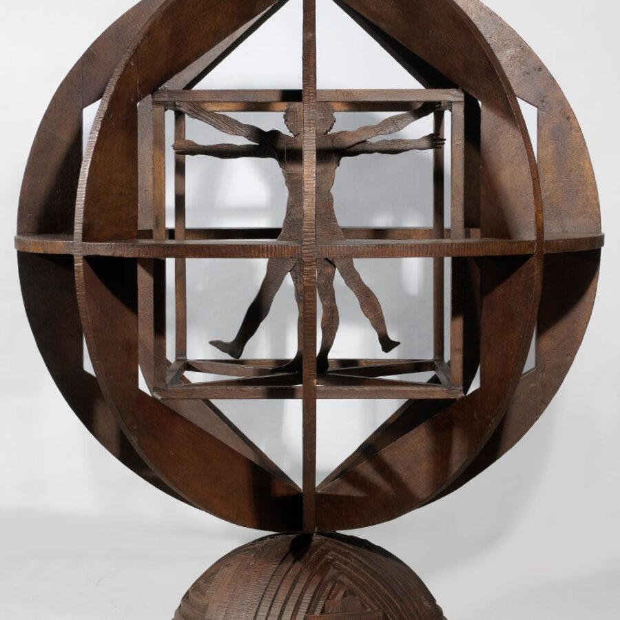 Con tale premessa, la mostra in corso riunisce quaranta opere – tra sculture e installazioni, insieme alle classiche silhouettes in legno, materiale prediletto dall’artista – a testimoniare una ricerca creativa caratterizzata dalla massima libertà. Così Squilibrio, del 1988, in una versione più piccola in bronzo – ispirata all’Uomo vitruviano di Leonardo – una tra le invenzioni più emblematiche di Ceroli (quasi un suo “logo”), è un’esplicita dichiarazione di tridimensionalità.