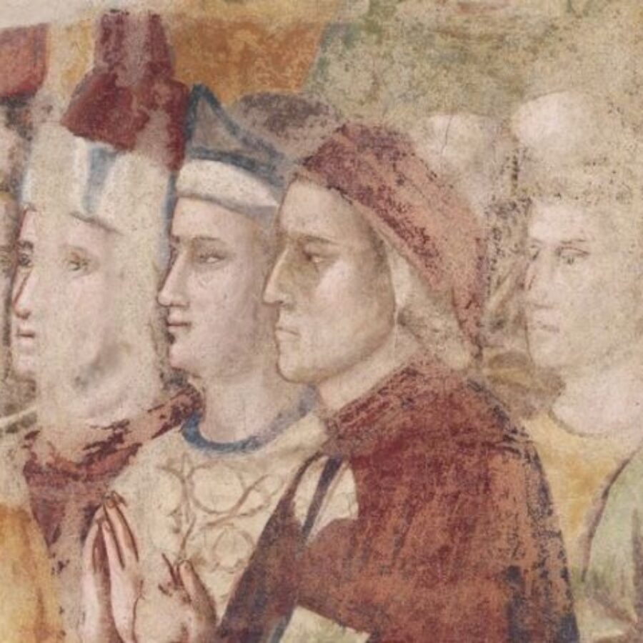 (l’otto gennaio 1337 Giotto muore lasciando incompiuto il suo ultimo capolavoro: la decorazione della Cappella nel Palazzo del Podestà. Cominciata nel 1333 durante la podesteria di Giorgio Tibaldeschi, fu poi interrotta e completata nel 1337 quando era podestà Fidesmino da Varano. Giotto eseguì la volta e la parte alta del Paradiso, il resto spetta per lo più alla sua bottega, che a queste date include personalità di altissimo livello, come Stefano, e pittori più giovani, come il Maestro di San Lucchese e Puccio di Simone. Dimenticate sotto lo scialbo, le pitture sono state riscoperte nell’Ottocento per ritrovare il ritratto di Dante ricordato dalle fonti. Sulla parete dell’altare Dante è raffigurato tra gli eletti del Paradiso, con la Commedia e un ramo di pomi tra le mani. Le due figure inginocchiate sono Fidesmino da Varano (a sinistra) e il vescovo Francesco Silvestri da Cingoli, a destra; i due accanto a loro che guardano lo spettatore sono rispettivamente il re Salomone – forse allusivo al Re Saggio, Roberto d’Angiò – e l’imperatore Traiano) - Bottega di Giotto (Stefano?), Inferno, particolare